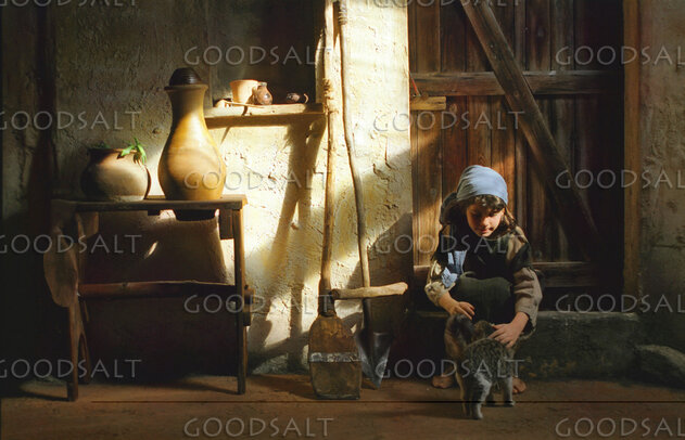 biblical scene girl cat interior utensils home room by Frank Gampel
