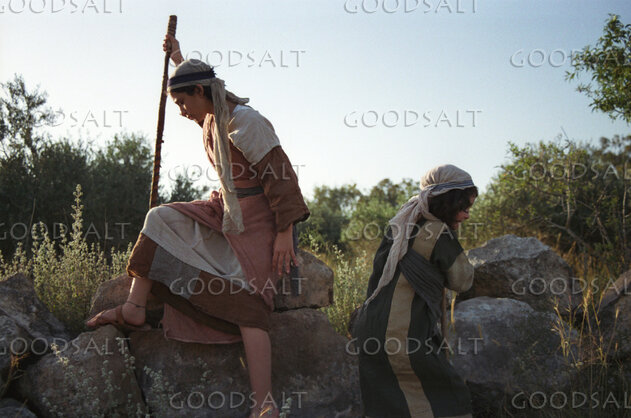 Two Hebrew children climbing rocks in outdoor setting. by Frank Gampel