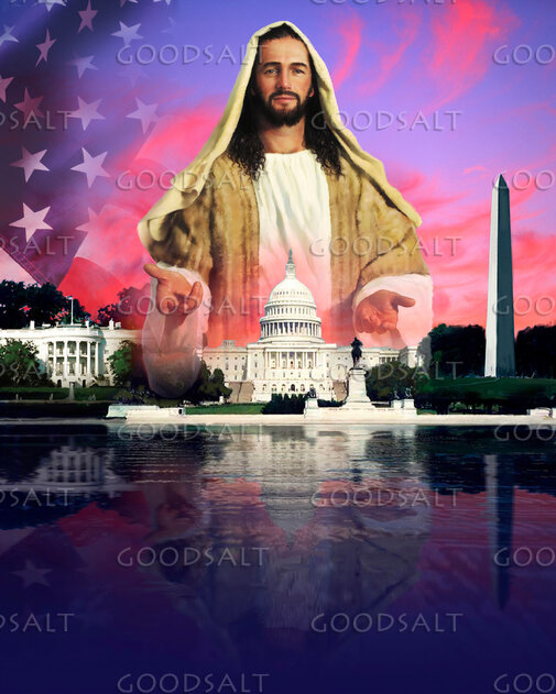 Christ depicted behind US capital and white house with flag behind Him by Lars Justinen