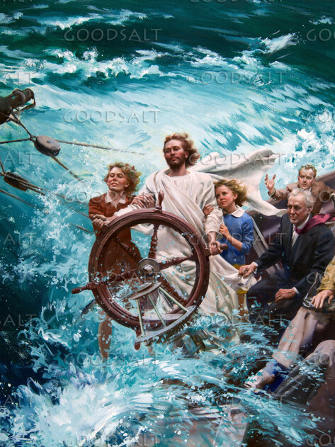 Jesus Christ is pictured as being at the helm of a ship steering the way safely through the storm. Waves break over the stern. Symbolic. Trust God in the storms of life. Harry Anderson painting.