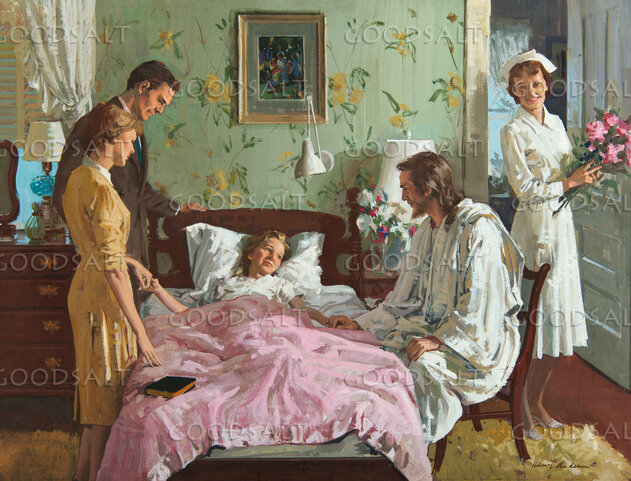 Jesus sit next to bed where little girl lays with parent standing by by Review & Herald Publishing