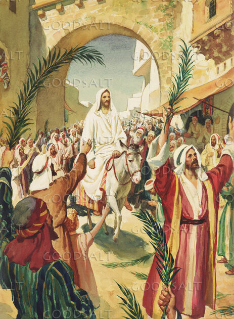 John 1212 The next day the large crowd that had come to the feast heard that Jesus was coming to Jerusalem.13 So they took branches of palm trees and went out to meet him, crying out, “Hosanna! Blessed is he who comes in the name of the Lord, even the King of Israel!”14 And Jesus found a young donkey and sat on it, just as it is written,15 “Fear not, daughter of Zion; behold, your king is coming, sitting on a donkey's colt!”16 His disciples did not understand these things at first, but when Jesus was glorified, then they remembered that these things had been written about him and had been done to him.17 The crowd that had been with him when he called Lazarus out of the tomb and raised him from the dead continued to bear witness.18 The reason why the crowd went to meet him was that they heard he had done this sign.19 So the Pharisees said to one another, “You see that you are gaining nothing. Look, the world has gone after him.” Luke 1928 And when he had said these things, he went on ahead, going up to Jerusalem.29 When he drew near to Bethphage and Bethany, at the mount that is called Olivet, he sent two of the disciples,30 saying, “Go into the village in front of you, where on entering you will find a colt tied, on which no one has ever yet sat. Untie it and bring it here.31 If anyone asks you, ‘Why are you untying it?’ you shall say this: ‘The Lord has need of it.’”32 So those who were sent went away and found it just as he had told them.33 And as they were untying the colt, its owners said to them, “Why are you untying the colt?”34 And they said, “The Lord has need of it.”35 And they brought it to Jesus, and throwing their cloaks on the colt, they set Jesus on it.36 And as he rode along, they spread their cloaks on the road.37 As he was drawing near—already on the way down the Mount of Olives—the whole multitude of his disciples began to rejoice and praise God with a loud voice for all the mighty works that they had seen,38 saying, “Blessed is the King who comes in the name of the Lord! Peace in heaven and glory in the highest!”39 And some of the Pharisees in the crowd said to him, “Teacher, rebuke your disciples.”40 He answered, “I tell you, if these were silent, the very stones would cry out.”41 And when he drew near and saw the city, he wept over it,42 saying, “Would that you, even you, had known on this day the things that make for peace! But now they are hidden from your eyes.43 For the days will come upon you, when your enemies will set up a barricade around you and surround you and hem you in on every side44 and tear you down to the ground, you and your children within you. And they will not leave one stone upon another in you, because you did not know the time of your visitation.” Mark 111 Now when they drew near to Jerusalem, to Bethphage and Bethany, at the Mount of Olives, Jesus sent two of his disciples2 and said to them, “Go into the village in front of you, and immediately as you enter it you will find a colt tied, on which no one has ever sat. Untie it and bring it.3 If anyone says to you, ‘Why are you doing this?’ say, ‘The Lord has need of it and will send it back here immediately.’”4 And they went away and found a colt tied at a door outside in the street, and they untied it.5 And some of those standing there said to them, “What are you doing, untying the colt?”6 And they told them what Jesus had said, and they let them go.7 And they brought the colt to Jesus and threw their cloaks on it, and he sat on it.8 And many spread their cloaks on the road, and others spread leafy branches that they had cut from the fields.9 And those who went before and those who followed were shouting, “Hosanna! Blessed is he who comes in the name of the Lord!10 Blessed is the coming kingdom of our father David! Hosanna in the highest!”11 And he entered Jerusalem and went into the temple. And when he had looked around at everything, as it was already late, he went out to Bethany with the twelve. Matthew 211 Now when they drew near to Jerusalem and came to Bethphage, to the Mount of Olives, then Jesus sent two disciples,2 saying to them, “Go into the village in front of you, and immediately you will find a donkey tied, and a colt with her. Untie them and bring them to me.3 If anyone says anything to you, you shall say, ‘The Lord needs them,’ and he will send them at once.”4 This took place to fulfill what was spoken by the prophet, saying,5 “Say to the daughter of Zion, ‘Behold, your king is coming to you, humble, and mounted on a donkey, and on a colt, the foal of a beast of burden.’”6 The disciples went and did as Jesus had directed them.7 They brought the donkey and the colt and put on them their cloaks, and he sat on them.8 Most of the crowd spread their cloaks on the road, and others cut branches from the trees and spread them on the road.9 And the crowds that went before him and that followed him were shouting, “Hosanna to the Son of David! Blessed is he who comes in the name of the Lord! Hosanna in the highest!”10 And when he entered Jerusalem, the whole city was stirred up, saying, “Who is this?”11 And the crowds said, “This is the prophet Jesus, from Nazareth of Galilee.” | |