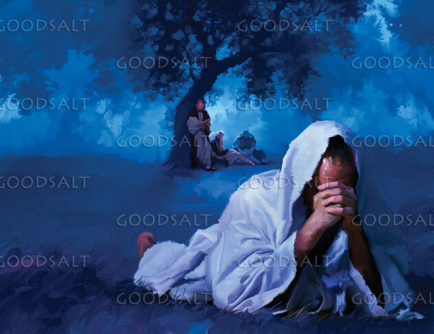 Jesus prays in the Garden of Gethsemane, just before his arrest. Peter, James and John sleep in the background. by General Conference