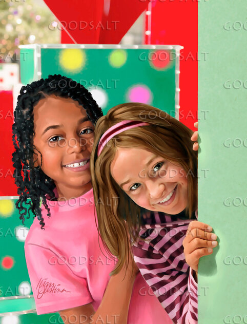 Two girls peek around Christmas decorations. by Kim Justinen