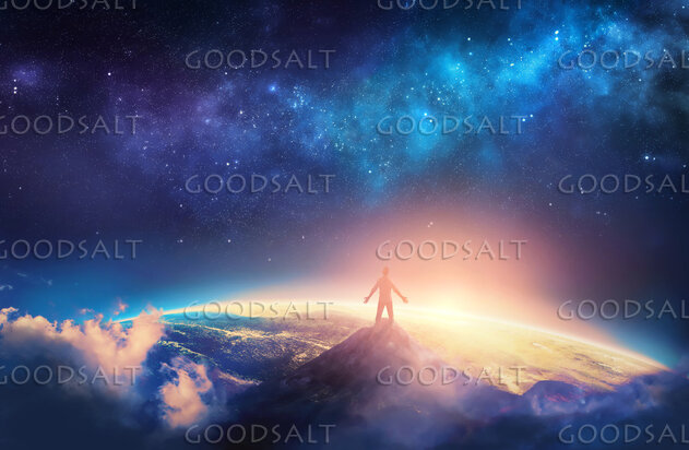 A man climbs a high mountain and lifts his arms up in praise by Kevin Carden