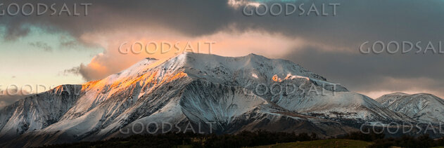 Sunrise on side of mountain range in snow. by Mal Austin