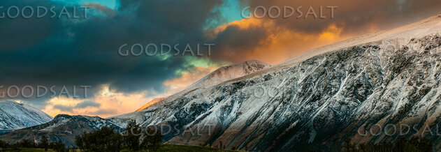 Sunrise and dramatic sky above side of mountains. by Mal Austin