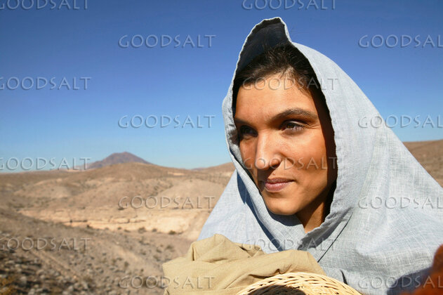 Close-up on an Isrealite woman carrying a basket with brown blanket wearing headdress by Erik Stenbakken