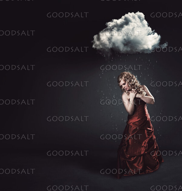 A woman is under a tiny cloud with rain drops falling on her. by Kevin Carden