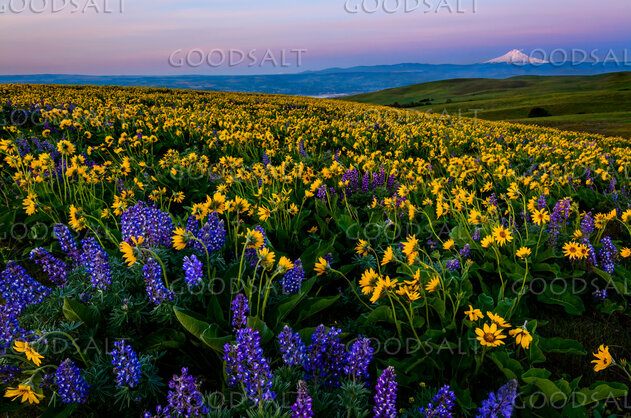 Sunrise from the Columbia Hills with spring flowers in the foreground and Mt. Hood in the background by Mary Lane Anderson