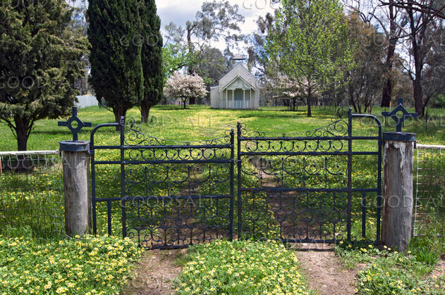 road to rarely-used country wooden church with closed wrought iron gates by Mal Austin