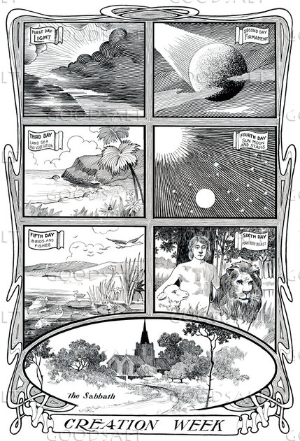 Genesis 11 In the beginning, God created the heavens and the earth.2 The earth was without form and void, and darkness was over the face of the deep. And the Spirit of God was hovering over the face of the waters.3 And God said, “Let there be light,” and there was light.4 And God saw that the light was good. And God separated the light from the darkness.5 God called the light Day, and the darkness he called Night. And there was evening and there was morning, the first day.6 And God said, “Let there be an expanse in the midst of the waters, and let it separate the waters from the waters.”7 And God made the expanse and separated the waters that were under the expanse from the waters that were above the expanse. And it was so.8 And God called the expanse Heaven. And there was evening and there was morning, the second day.9 And God said, “Let the waters under the heavens be gathered together into one place, and let the dry land appear.” And it was so.10 God called the dry land Earth, and the waters that were gathered together he called Seas. And God saw that it was good.11 And God said, “Let the earth sprout vegetation, plants yielding seed, and fruit trees bearing fruit in which is their seed, each according to its kind, on the earth.” And it was so.12 The earth brought forth vegetation, plants yielding seed according to their own kinds, and trees bearing fruit in which is their seed, each according to its kind. And God saw that it was good.13 And there was evening and there was morning, the third day.14 And God said, “Let there be lights in the expanse of the heavens to separate the day from the night. And let them be for signs and for seasons, and for days and years,15 and let them be lights in the expanse of the heavens to give light upon the earth.” And it was so.16 And God made the two great lights—the greater light to rule the day and the lesser light to rule the night—and the stars.17 And God set them in the expanse of the heavens to give light on the earth,18 to rule over the day and over the night, and to separate the light from the darkness. And God saw that it was good.19 And there was evening and there was morning, the fourth day.20 And God said, “Let the waters swarm with swarms of living creatures, and let birds fly above the earth across the expanse of the heavens.”21 So God created the great sea creatures and every living creature that moves, with which the waters swarm, according to their kinds, and every winged bird according to its kind. And God saw that it was good.22 And God blessed them, saying, “Be fruitful and multiply and fill the waters in the seas, and let birds multiply on the earth.”23 And there was evening and there was morning, the fifth day.24 And God said, “Let the earth bring forth living creatures according to their kinds—livestock and creeping things and beasts of the earth according to their kinds.” And it was so.25 And God made the beasts of the earth according to their kinds and the livestock according to their kinds, and everything that creeps on the ground according to its kind. And God saw that it was good.26 Then God said, “Let us make man in our image, after our likeness. And let them have dominion over the fish of the sea and over the birds of the heavens and over the livestock and over all the earth and over every creeping thing that creeps on the earth.”27 So God created man in his own image, in the image of God he created him; male and female he created them.28 And God blessed them. And God said to them, “Be fruitful and multiply and fill the earth and subdue it and have dominion over the fish of the sea and over the birds of the heavens and over every living thing that moves on the earth.”29 And God said, “Behold, I have given you every plant yielding seed that is on the face of all the earth, and every tree with seed in its fruit. You shall have them for food.30 And to every beast of the earth and to every bird of the heavens and to everything that creeps on the earth, everything that has the breath of life, I have given every green plant for food.” And it was so.31 And God saw everything that he had made, and behold, it was very good. And there was evening and there was morning, the sixth day. | |