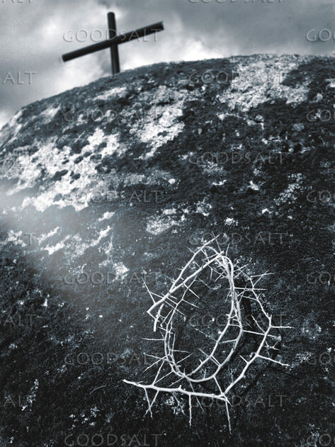 A cross on a hill with a ray of light shining on a crown of thorns. by Mal Austin