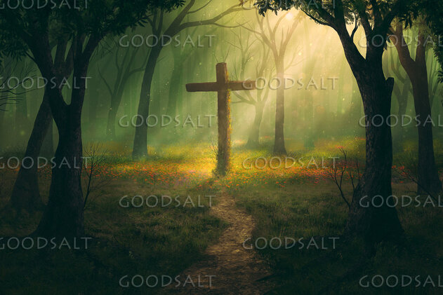 A single cross in wildflowers in the forest. by Kevin Carden