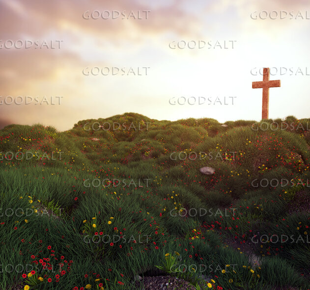 A single cross on top of a grassy hill with wild flowers by Kevin Carden