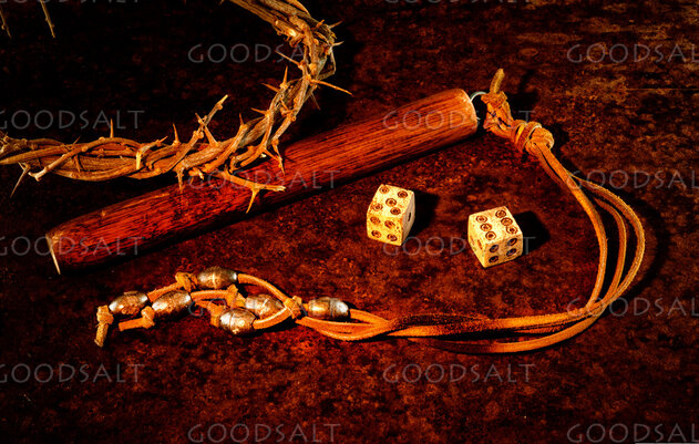 Still life type photograph of a crown of thorns, a Roman scourge and Roman dice. by Jim Work