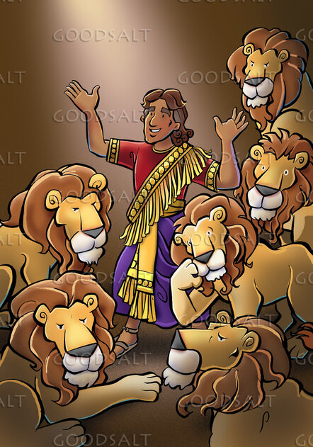 Daniel in the Lion's Den. The lions mouths have been closed. Children't division art. Part of a series. by Kim Justinen