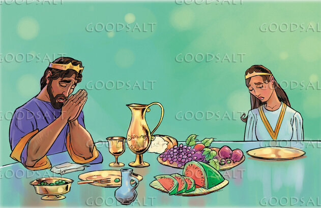 David and Bathsheba, saddened over the death of their infant, pray a prayer of thanks for their food. by Bible Adventure Collection