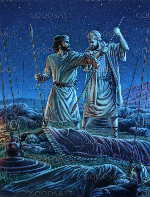 David refuses to kill King Saul when he had the opportunity and Saul was asleep. David sneaked over and cut off a piece of Saul's robe but Saul did not realize. Later David confesses what he did and shows Saul the piece of cloth to prove that he could have killed Saul. Saul appreciated it. That picture is in shades of blue. Saul is asleep under blankets on the ground and David is pushing away the spear of one of his men.