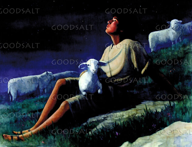 A nighttime scene, David is sitting on a rock in a hillside pasture. Some sheep are nearby. by Lifeway Collection