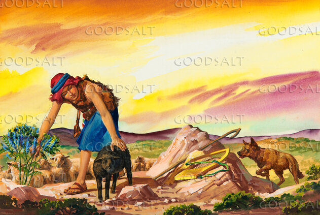 Young David proteting his sheep the little black lamb from dangers. Part of a series. by Review & Herald Publishing