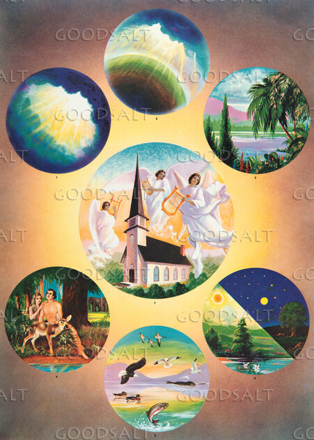 Image shows each day of creation and what was created. Day of worship in the center. Each is depicted in a circle. by Review & Herald Publishing