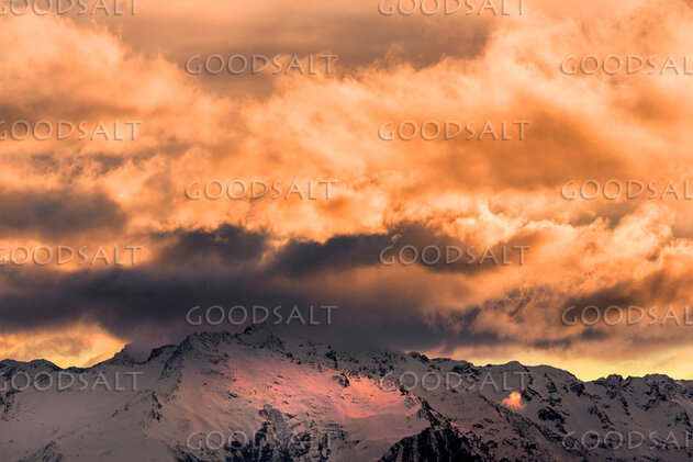 Dazzling pink sunset with yellow clouds over long line of mountains covered in snow. by Mal Austin