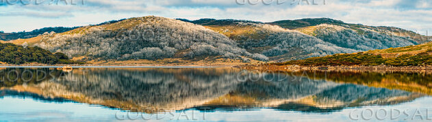The numerous dead trunks of fire affected snow gums dominate the rocky landscape and its reflection on the surface of an alpine lake. by Mal Austin