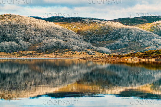 The numerous dead trunks of fire affected snow gums dominate the rocky landscape and its reflection on the surface of an alpine lake. by Mal Austin