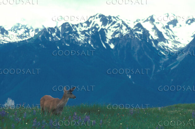 Deer and wildflowers in the Olympic Mountains by John Baker