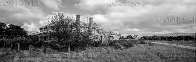 Abandoned farmhouse with front fenced garden and rear machinery shed. by Mal Austin