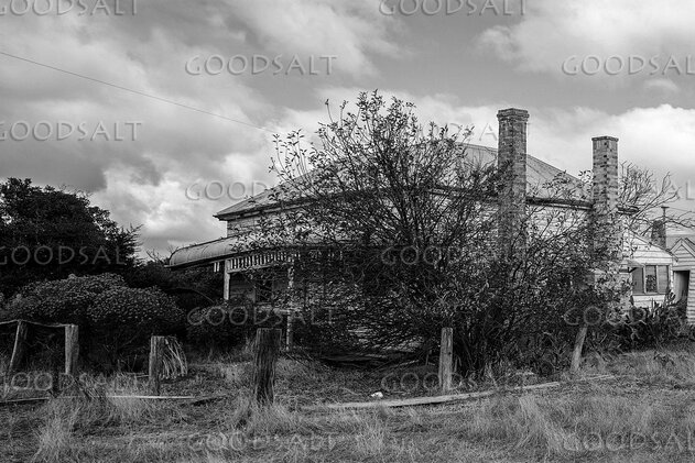 Abandoned farmhouse with front fenced garden and rear machinery shed. by Mal Austin