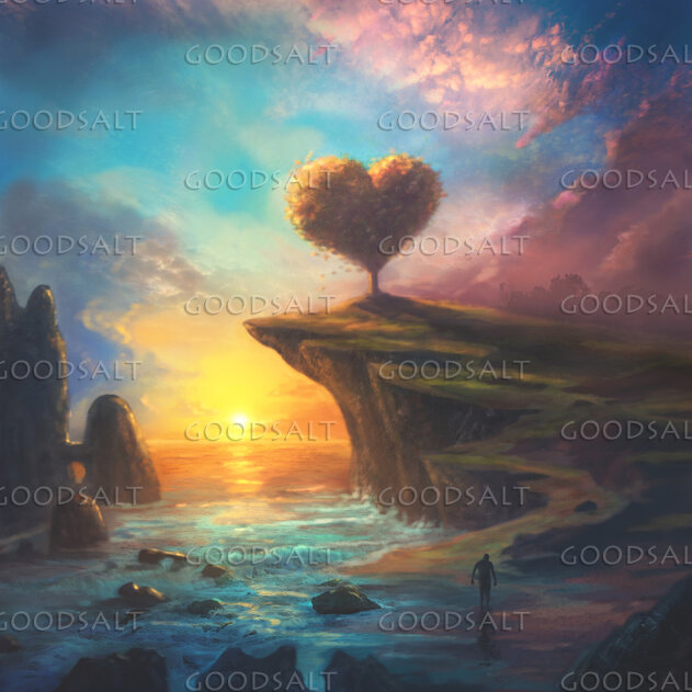A digital painting with a beautiful sunset and landscape with a heart shaped tree by Kevin Carden
