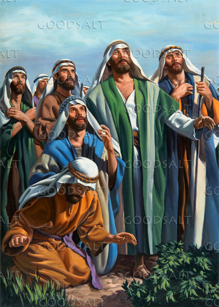 The disciples watch the ascension of Jesus into the clouds. Focus is on the disciples. Jesus is not shown. Two disciples on their knees...the rest standing....close up.