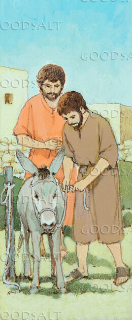 Picture shows two men untying a young donkey that is tied to a post. Jesus has told them to do this and to bring it to Him near Bethany so He could ride it into Jerusalem. They are going to obey Him. There are plain, square buildings and a stone wall in the background.