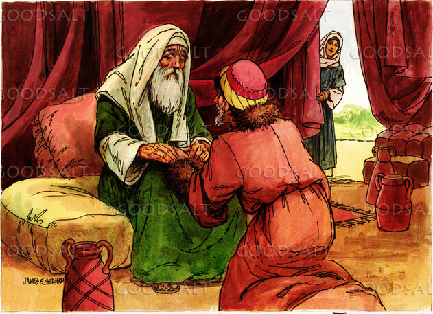 Genesis 271 When Isaac was old and his eyes were dim so that he could not see, he called Esau his older son and said to him, “My son”; and he answered, “Here I am.”2 He said, “Behold, I am old; I do not know the day of my death.3 Now then, take your weapons, your quiver and your bow, and go out to the field and hunt game for me,4 and prepare for me delicious food, such as I love, and bring it to me so that I may eat, that my soul may bless you before I die.”5 Now Rebekah was listening when Isaac spoke to his son Esau. So when Esau went to the field to hunt for game and bring it,6 Rebekah said to her son Jacob, “I heard your father speak to your brother Esau,7 ‘Bring me game and prepare for me delicious food, that I may eat it and bless you before the LORD before I die.’8 Now therefore, my son, obey my voice as I command you.9 Go to the flock and bring me two good young goats, so that I may prepare from them delicious food for your father, such as he loves.10 And you shall bring it to your father to eat, so that he may bless you before he dies.”11 But Jacob said to Rebekah his mother, “Behold, my brother Esau is a hairy man, and I am a smooth man.12 Perhaps my father will feel me, and I shall seem to be mocking him and bring a curse upon myself and not a blessing.”13 His mother said to him, “Let your curse be on me, my son; only obey my voice, and go, bring them to me.”14 So he went and took them and brought them to his mother, and his mother prepared delicious food, such as his father loved.15 Then Rebekah took the best garments of Esau her older son, which were with her in the house, and put them on Jacob her younger son.16 And the skins of the young goats she put on his hands and on the smooth part of his neck.17 And she put the delicious food and the bread, which she had prepared, into the hand of her son Jacob.18 So he went in to his father and said, “My father.” And he said, “Here I am. Who are you, my son?”19 Jacob said to his father, “I am Esau your firstborn. I have done as you told me; now sit up and eat of my game, that your soul may bless me.”20 But Isaac said to his son, “How is it that you have found it so quickly, my son?” He answered, “Because the LORD your God granted me success.”21 Then Isaac said to Jacob, “Please come near, that I may feel you, my son, to know whether you are really my son Esau or not.”22 So Jacob went near to Isaac his father, who felt him and said, “The voice is Jacob's voice, but the hands are the hands of Esau.”23 And he did not recognize him, because his hands were hairy like his brother Esau's hands. So he blessed him.24 He said, “Are you really my son Esau?” He answered, “I am.”25 Then he said, “Bring it near to me, that I may eat of my son's game and bless you.” So he brought it near to him, and he ate; and he brought him wine, and he drank.26 Then his father Isaac said to him, “Come near and kiss me, my son.”27 So he came near and kissed him. And Isaac smelled the smell of his garments and blessed him and said, “See, the smell of my son is as the smell of a field that the LORD has blessed!28 May God give you of the dew of heaven and of the fatness of the earth and plenty of grain and wine.29 Let peoples serve you, and nations bow down to you. Be lord over your brothers, and may your mother's sons bow down to you. Cursed be everyone who curses you, and blessed be everyone who blesses you!”30 As soon as Isaac had finished blessing Jacob, when Jacob had scarcely gone out from the presence of Isaac his father, Esau his brother came in from his hunting.31 He also prepared delicious food and brought it to his father. And he said to his father, “Let my father arise and eat of his son's game, that you may bless me.”32 His father Isaac said to him, “Who are you?” He answered, “I am your son, your firstborn, Esau.”33 Then Isaac trembled very violently and said, “Who was it then that hunted game and brought it to me, and I ate it all before you came, and I have blessed him? Yes, and he shall be blessed.”34 As soon as Esau heard the words of his father, he cried out with an exceedingly great and bitter cry and said to his father, “Bless me, even me also, O my father!”35 But he said, “Your brother came deceitfully, and he has taken away your blessing.”36 Esau said, “Is he not rightly named Jacob? For he has cheated me these two times. He took away my birthright, and behold, now he has taken away my blessing.” Then he said, “Have you not reserved a blessing for me?”37 Isaac answered and said to Esau, “Behold, I have made him lord over you, and all his brothers I have given to him for servants, and with grain and wine I have sustained him. What then can I do for you, my son?”38 Esau said to his father, “Have you but one blessing, my father? Bless me, even me also, O my father.” And Esau lifted up his voice and wept.39 Then Isaac his father answered and said to him: “Behold, away from the fatness of the earth shall your dwelling be, and away from the dew of heaven on high.40 By your sword you shall live, and you shall serve your brother; but when you grow restless you shall break his yoke from your neck.”41 Now Esau hated Jacob because of the blessing with which his father had blessed him, and Esau said to himself, “The days of mourning for my father are approaching; then I will kill my brother Jacob.”42 But the words of Esau her older son were told to Rebekah. So she sent and called Jacob her younger son and said to him, “Behold, your brother Esau comforts himself about you by planning to kill you.43 Now therefore, my son, obey my voice. Arise, flee to Laban my brother in Haran44 and stay with him a while, until your brother's fury turns away—45 until your brother's anger turns away from you, and he forgets what you have done to him. Then I will send and bring you from there. Why should I be bereft of you both in one day?”46 Then 