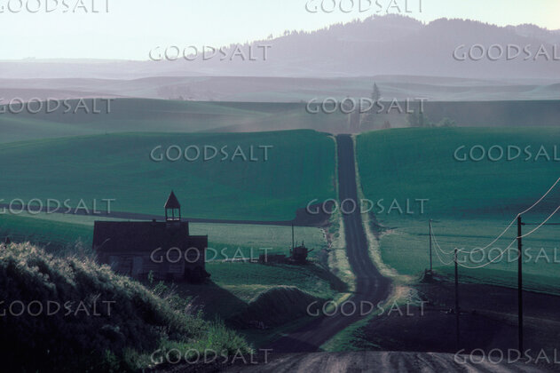 A road passes a church into distant hills by John Clement