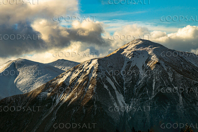 Snow-capped mountains with lower areas of rock and lingering clouds. by Mal Austin