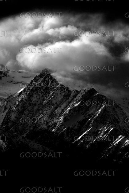 Dramatic B&W portrait of rugged rocky and snowed mountain range in strong early light.
