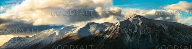 Distant mountains with snow, dramatic skies.