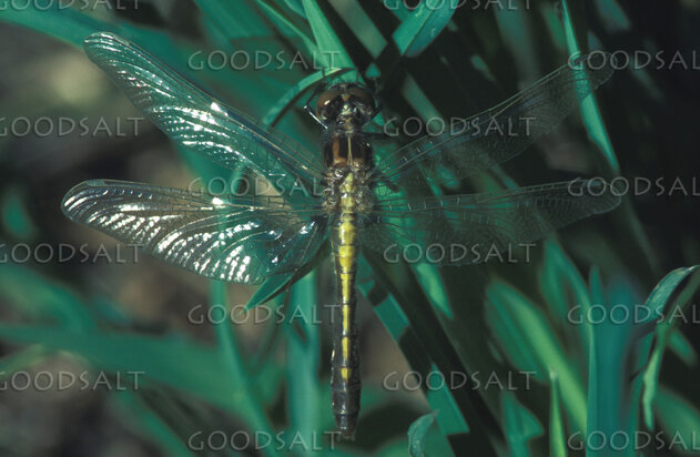 Dragonfly clings to blade of grass. by John Baker