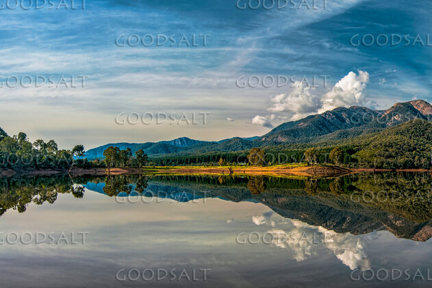 Perfect reflection in the waters of country lake showing tree lined far bank, large mountain and spectacular cloud display in blue sky. by Mal Austin