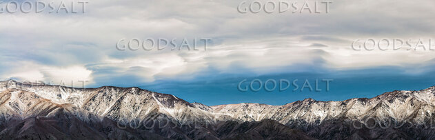 A line of lenticular clouds sweeps across the entire length of distant range. by Mal Austin