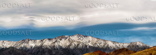 Dramatic stormy Lenticular clouds sit above snowy mountains.