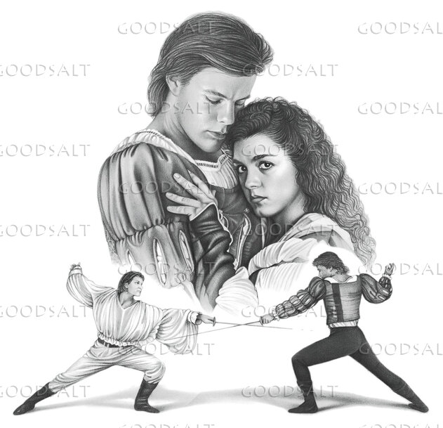 Two lovers embrass with image of sword duelers in foreground by Darrel Tank