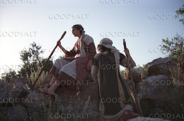 Two Hebrew children sitting on rocks in rural setting at dusk. by Frank Gampel