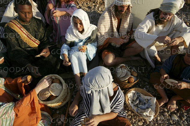 41 And taking the five loaves and the two fish he looked up to heaven and said a blessing and broke the loaves and gave them to the disciples to set before the people. And he divided the two fish among them all.