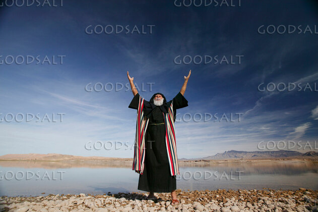 An elderly Israelite man stands with lake at his back raising arms to the Lord by Erik Stenbakken