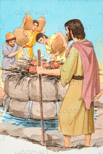 32 and with the stones he built an altar in the name of the LORD. And he made a trench about the altar, as great as would contain two seahs of seed.33 And he put the wood in order and cut the bull in pieces and laid it on the wood. And he said, “Fill four jars with water and pour it on the burnt offering and on the wood.”34 And he said, “Do it a second time.” And they did it a second time. And he said, “Do it a third time.” And they did it a third time.35 And the water ran around the altar and filled the trench also with water.