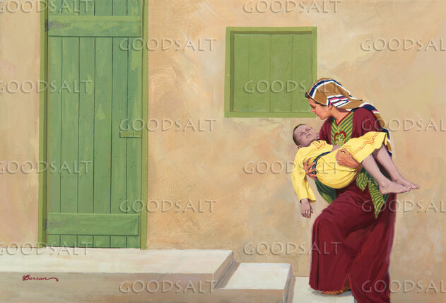 The Shunammite woman carries her dead son up to Elisha's upper room. by Review & Herald Publishing